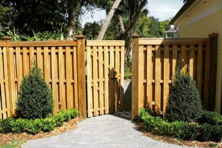 La palissade est peut-être la clôture en bois la plus polyvalente en termes de simplicité et de praticité. Il a l'air plus léger et plus élégant qu'une palissade, mais donne toujours un sentiment d'intimité et un espace fermé. Pour un support solide, il est préférable d'utiliser des tuyaux métalliques ou des poutres épaisses.